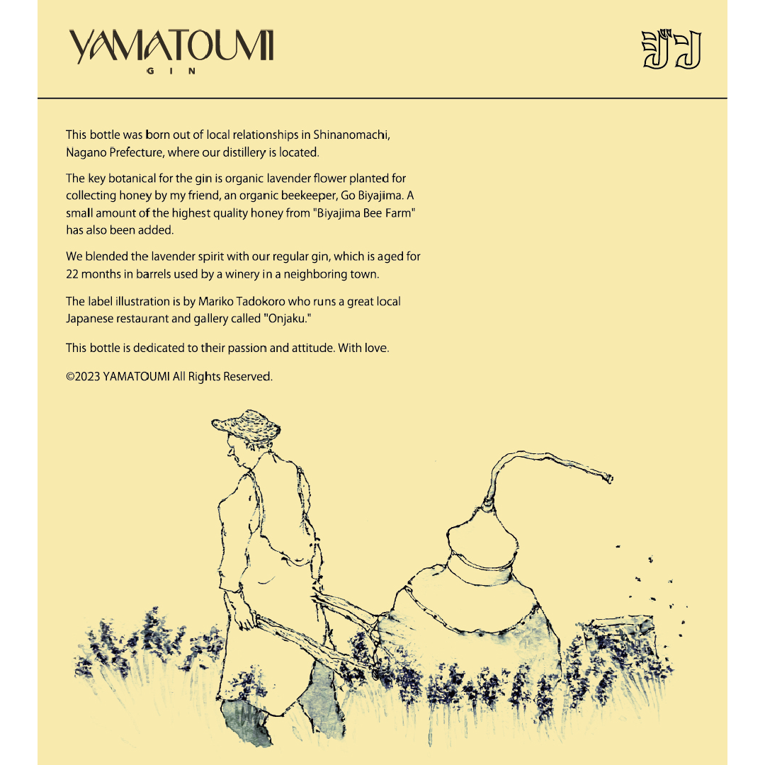 蒸留所のある長野県信濃町を中心に北信地域で有機養蜂を営む、「美谷島養蜂」さんが採蜜用に植えたラベンダーの花を分けてもらい、蒸留した濃いラベンダーのスピリッツを、ご近所の某ワイナリーさんが使っていたワイン樽で寝かせていたYAMATOUMI GINにブレンドして仕上げました。